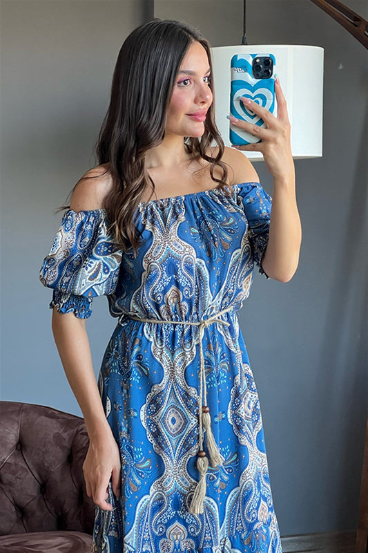 3 AL 2 ÖDEHasır kemerli etnik desen mavi elbise