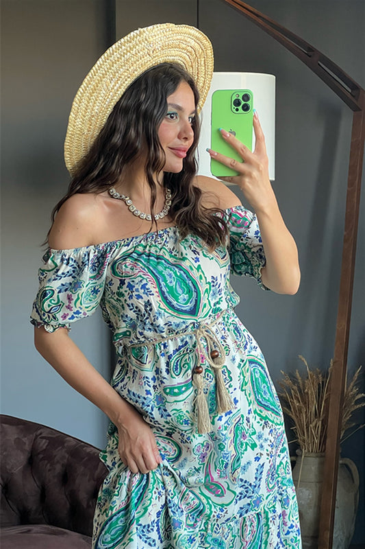 3 AL 2 ÖDEHasır kemerli etnik desen yeşil elbise