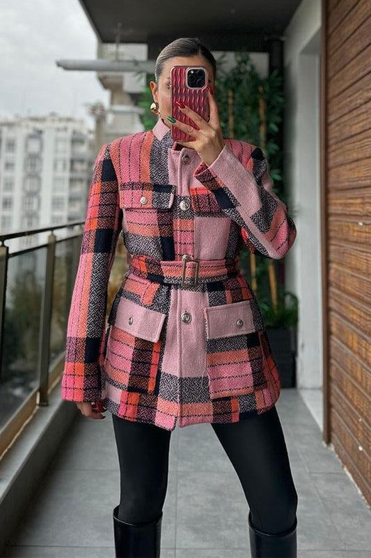 3 AL 2 ÖDEHauss Kemerli Kaşe Ceket - Pembe Ekose