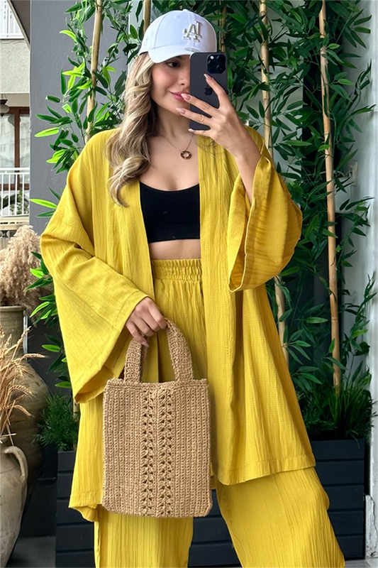 3 AL 2 ÖDEHavana kimonolu bohem takım - Hardal Sarı