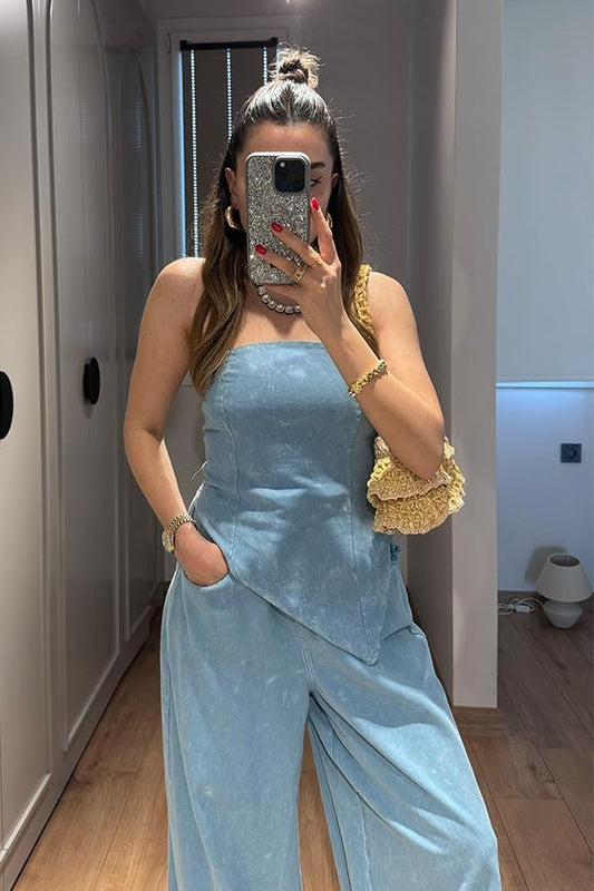 3 AL 2 ÖDEHoliday Yıkamalı Crop Pantolon Takım - Mavi