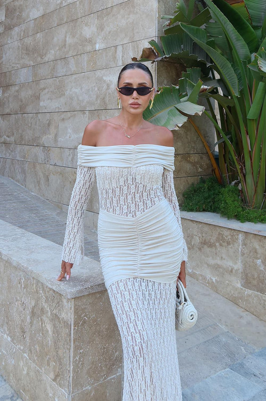 3 AL 2 ÖDEBEYAZ DANTEL DETAYLI MADONNA YAKA ELBISE