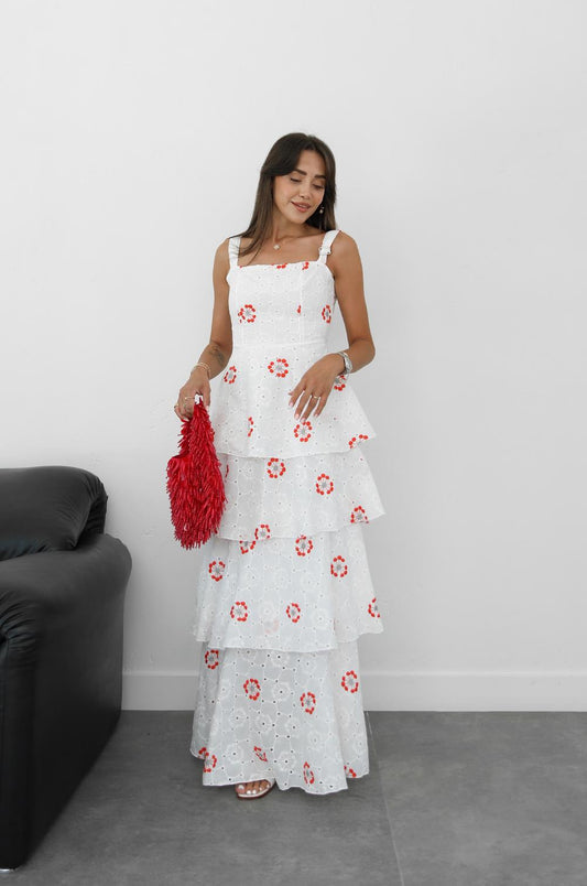 3 AL 2 ÖDEBEYAZ KIRMIZI ÇIÇEK DESENLI KAT KAT ELBISE