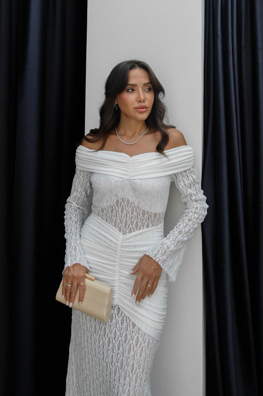 3 AL 2 ÖDEBEYAZ DANTEL DETAYLI MADONNA YAKA ELBISE