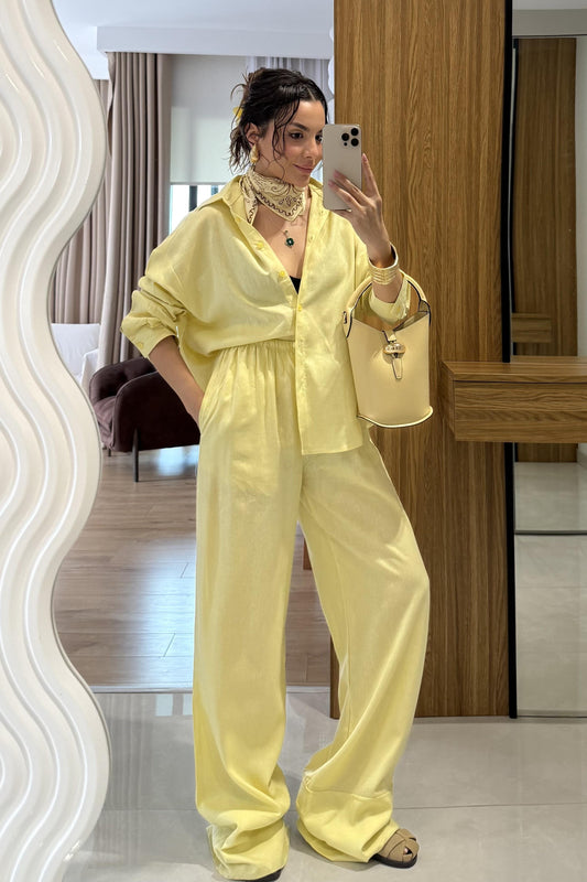 • Peru Sarı Ham Keten Gömlek Pantolon Takım