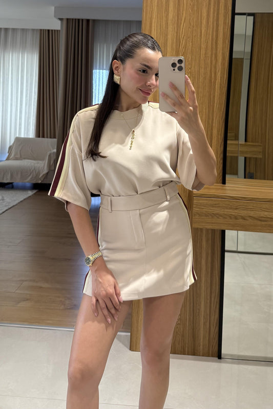 Palmas Krem Yarım Kollu Şerit Detay Şortlu Premium Takım