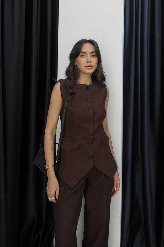 3 AL 2 ÖDEKAHVERENGI ARKASI KEMERLI KETEN YELEK
