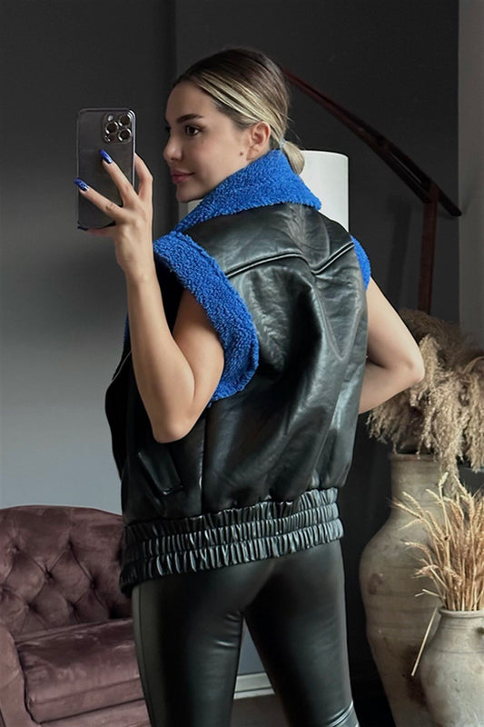 Bel gipeli kürk detaylı deri yelek - Saks mavi