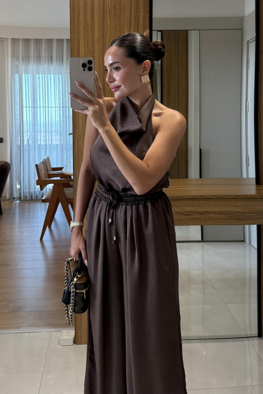3 AL 2 ÖDEJullie Acı Kahve Saten Bluz Pantolon Takım