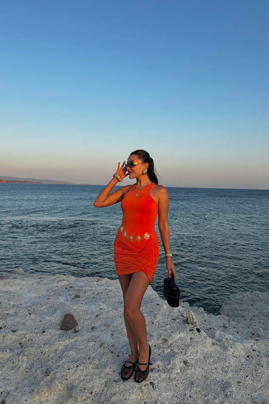 3 AL 2 ÖDEIsla Turuncu Vücudu Saran Mini Elbise
