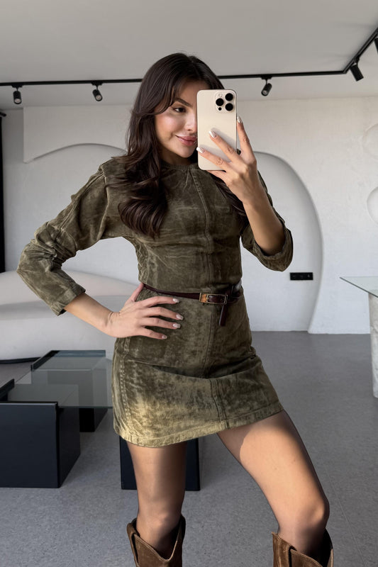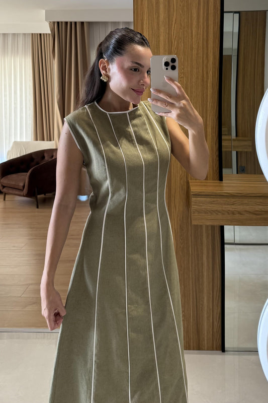 3 AL 2 ÖDEJadore Haki Biyeli Keten Elbise