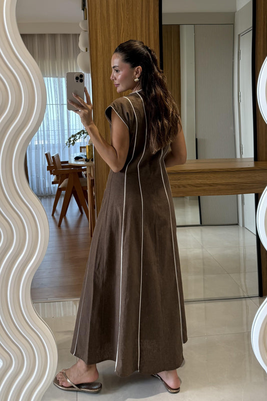3 AL 2 ÖDEJadore Kahve Biyeli Keten Elbise