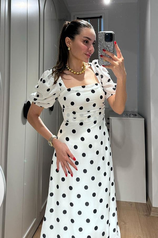3 AL 2 ÖDEİmani Puantiyeli Tasarım Midi Elbise-Beyaz