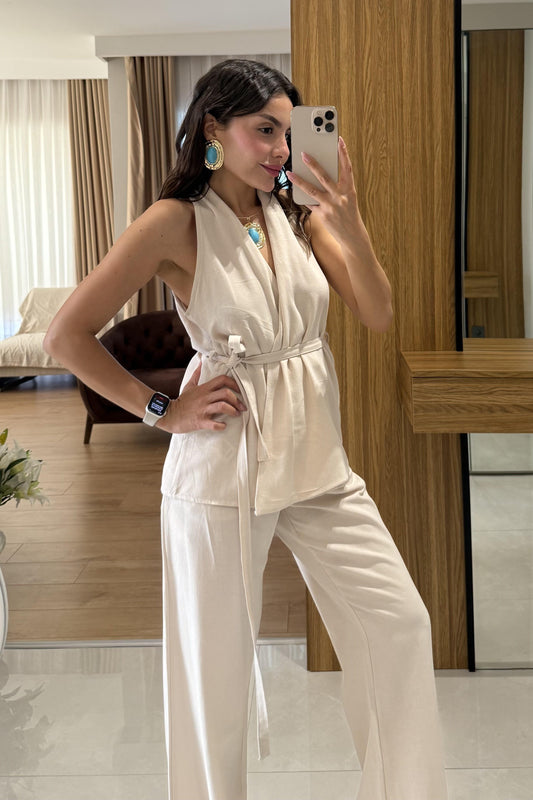 Mintara Bej Kuşaklı Yelek Pantolon Keten Takım