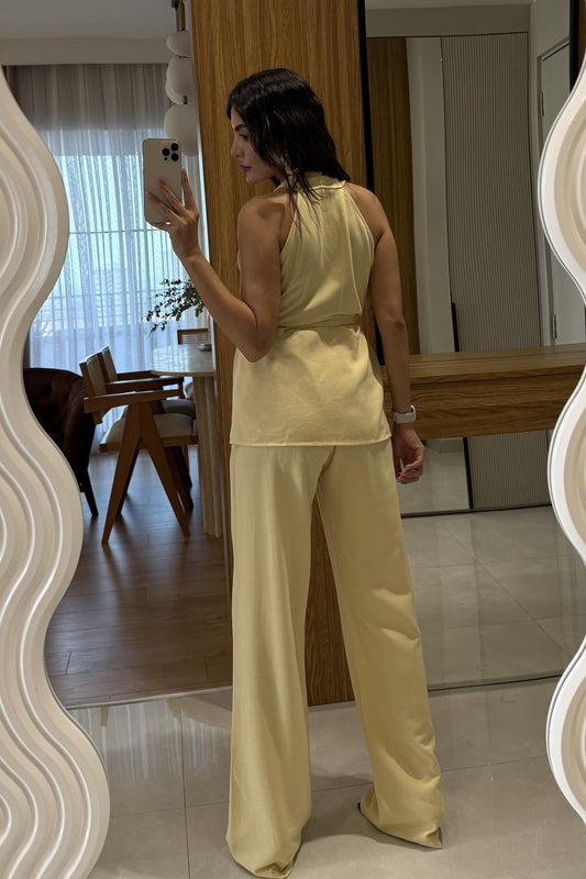 Mintara Sarı Kuşaklı Yelek Pantolon Keten Takım