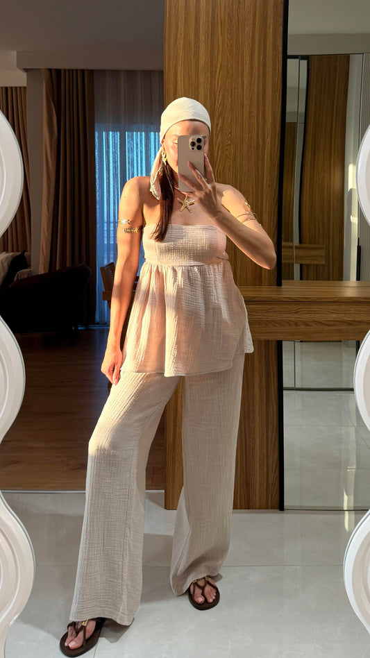 3 AL 2 ÖDEMatias Krem Müslin Bandanalı İkili Takım