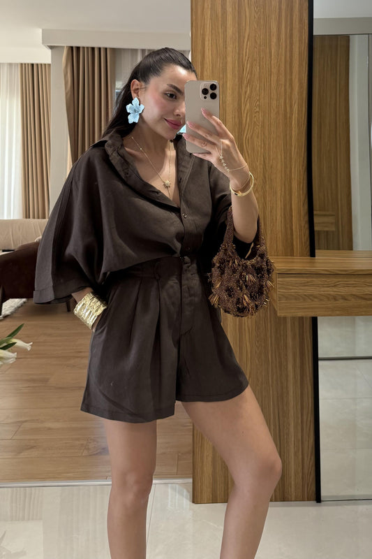 3 AL 2 ÖDEMareis Kahve Gömlek Şort Keten Takım