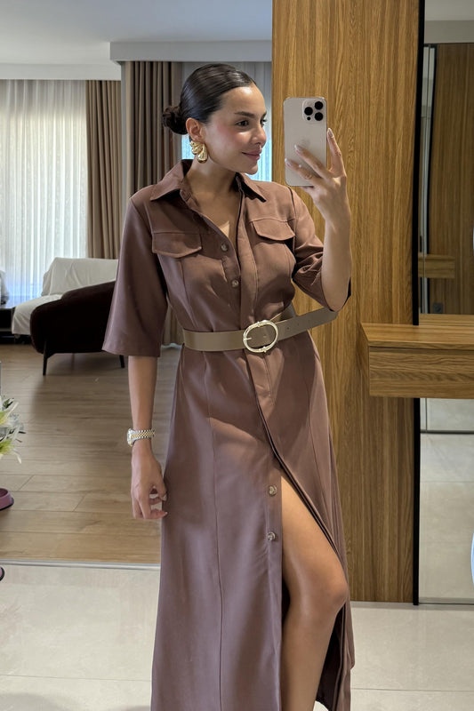 3 AL 2 ÖDEDawny Kahve Kemerli Cep Detaylı Elbise