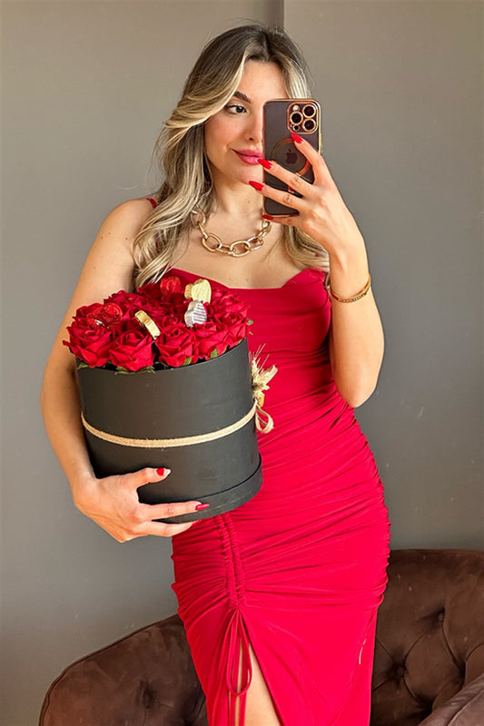 3 AL 2 ÖDEDegaje yaka önden drapeli kırmızı elbise