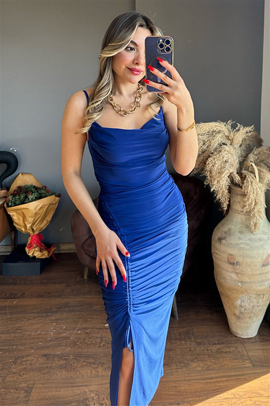 3 AL 2 ÖDEDegaje yaka önden drapeli saks mavi elbise