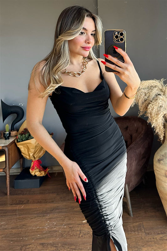 3 AL 2 ÖDEDegaje yaka önden drapeli siyah elbise