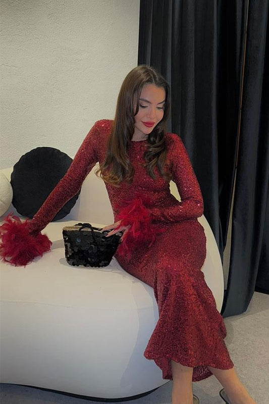 Cindy Bilek Tüy Detaylı Pulpayet Kırmızı Elbise
