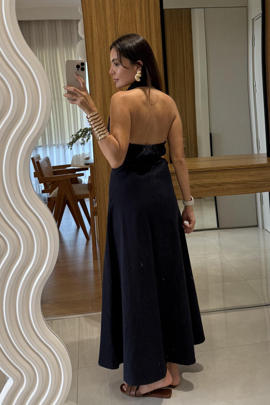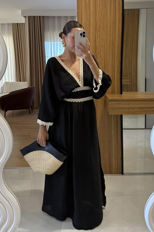 3 AL 2 ÖDEChandra Siyah V Yaka Keten Elbise