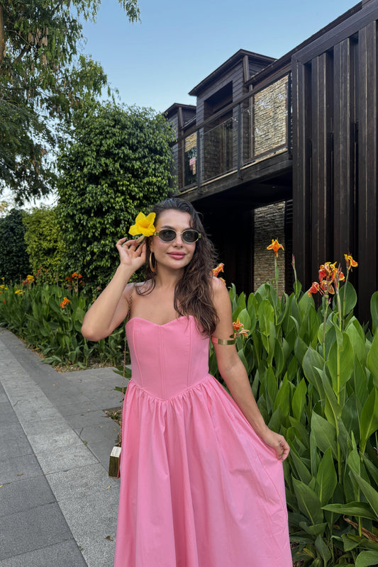 3 AL 2 ÖDECheren Pembe Aksesuarlı Bel Dekolteli Elbise