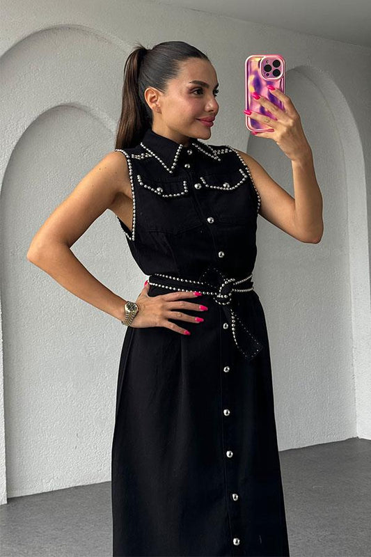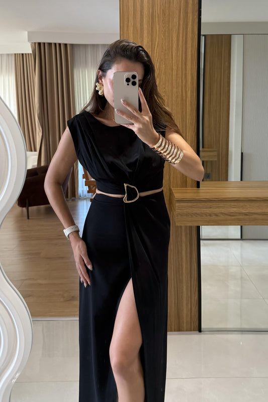 3 AL 2 ÖDECheren Siyah Aksesuarlı Bel Dekolteli Elbise