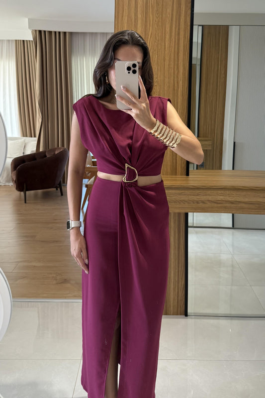 3 AL 2 ÖDECheren Vişne Aksesuarlı Bel Dekolteli Elbise