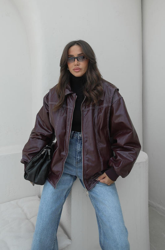 3 AL 2 ÖDEKIRMIZI DIKIŞ DETAYLI ASTARLI DERI CEKET