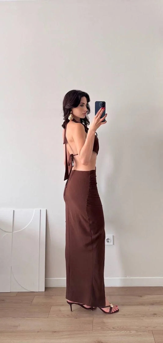 3 AL 2 ÖDEKahverengi Toka Detaylı Büzgülü Midi Elbise