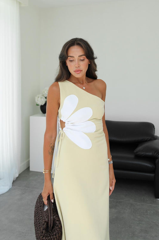 3 AL 2 ÖDEAÇIK SARI YAN DEKOLTE KISMI ÇIÇEKLI ELBISE
