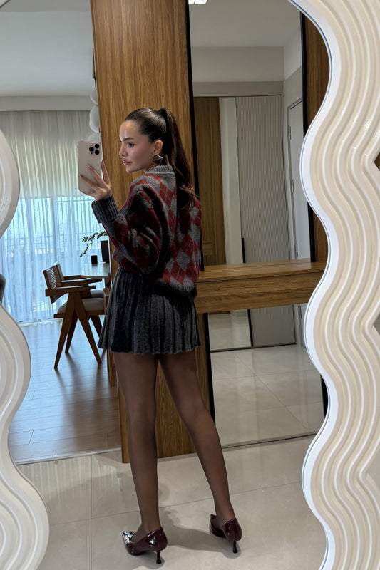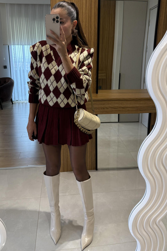 Woody Bordo-Antrasit Baklava Desen Etekli Takım
