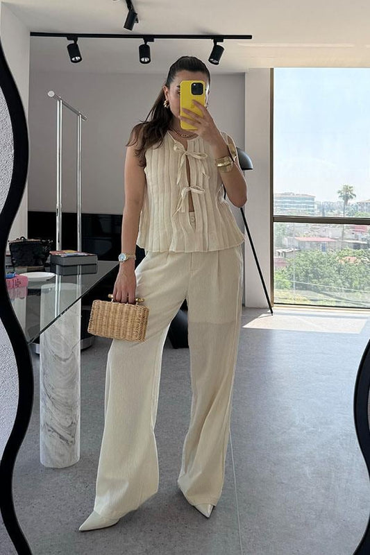Presy Keten Bağlamalı Pantolon Yelek Takım-Krem