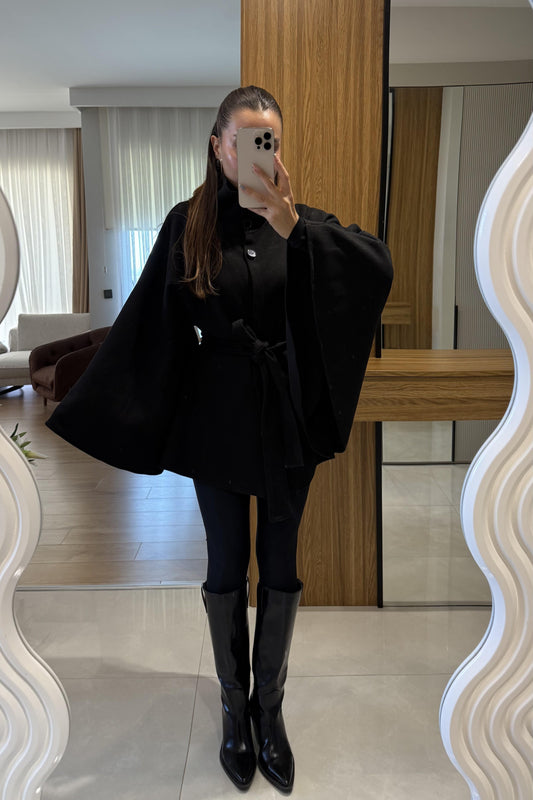 3 AL 2 ÖDEPerolas Siyah Kemer Detaylı Kaşe Panço