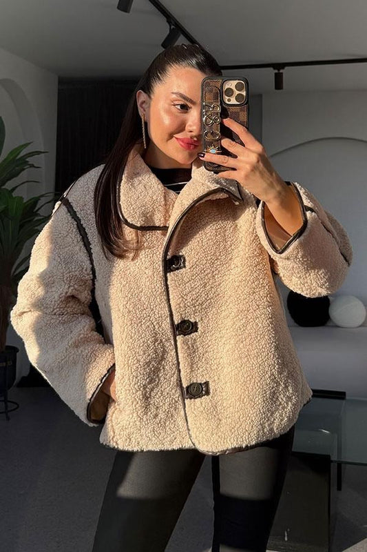 3 AL 2 ÖDEJovia Krem Peluş Deri Detaylı Ceket