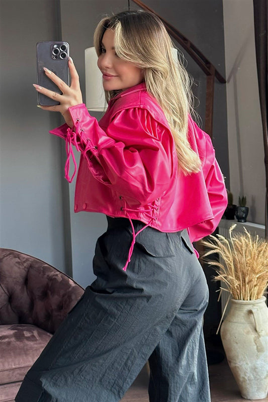 3 AL 2 ÖDEİp detaylı pembe deri bomber ceket