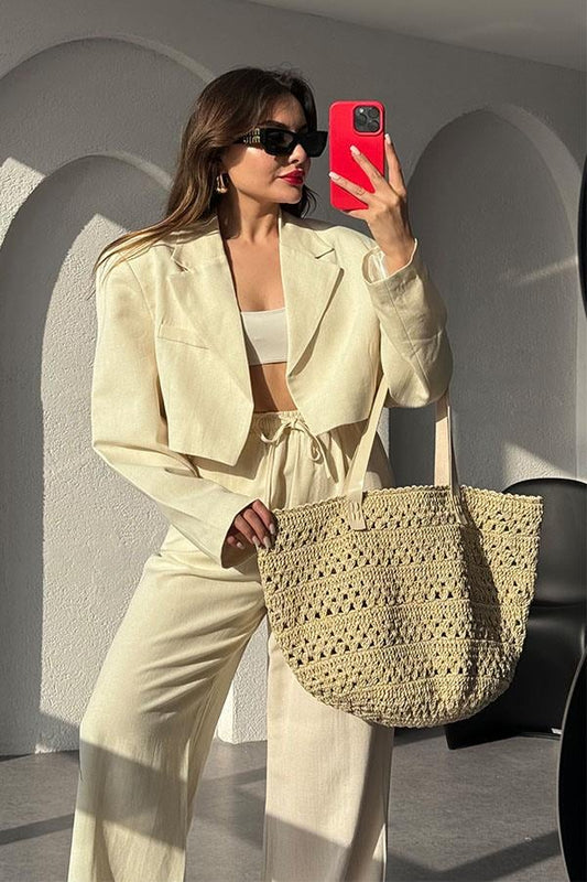 3 AL 2 ÖDEJanis Premium Keten Crop Blazer Ceket -Ekru