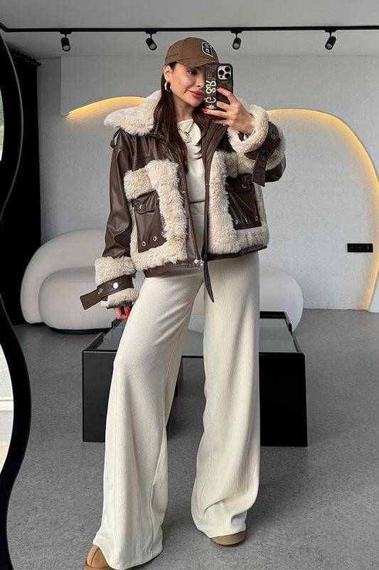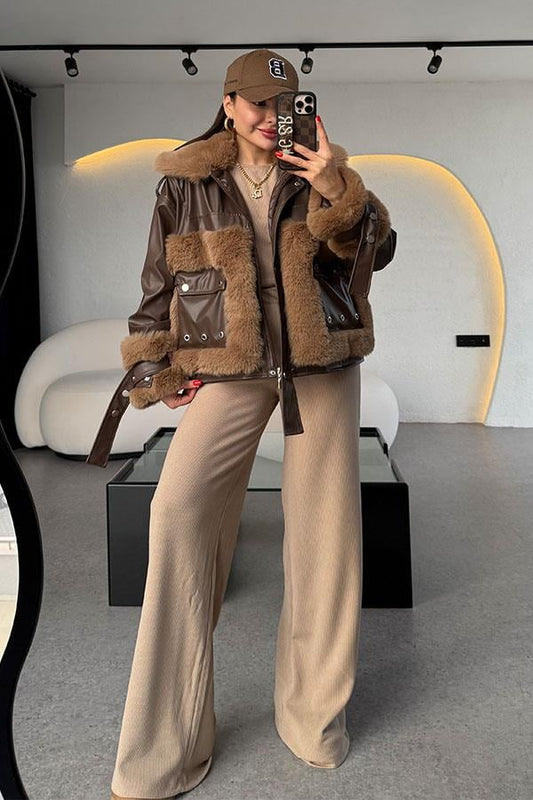 3 AL 2 ÖDEJanus Kahve Kürklü Deri Ceket
