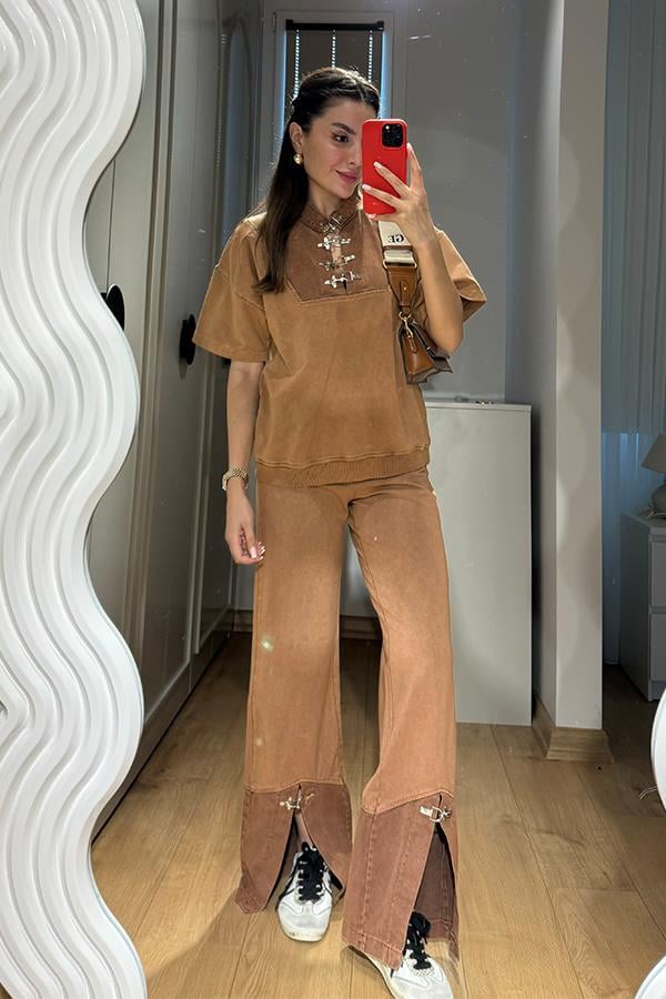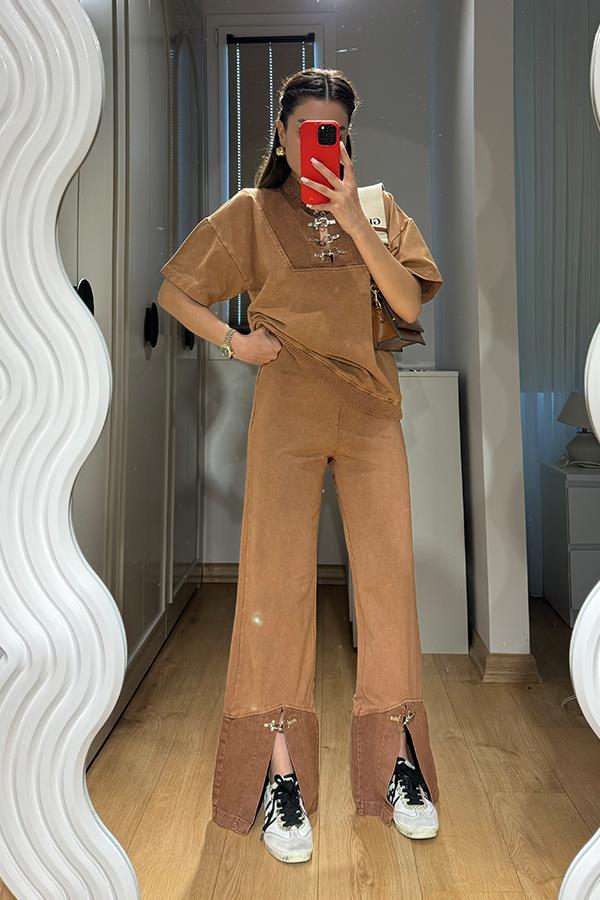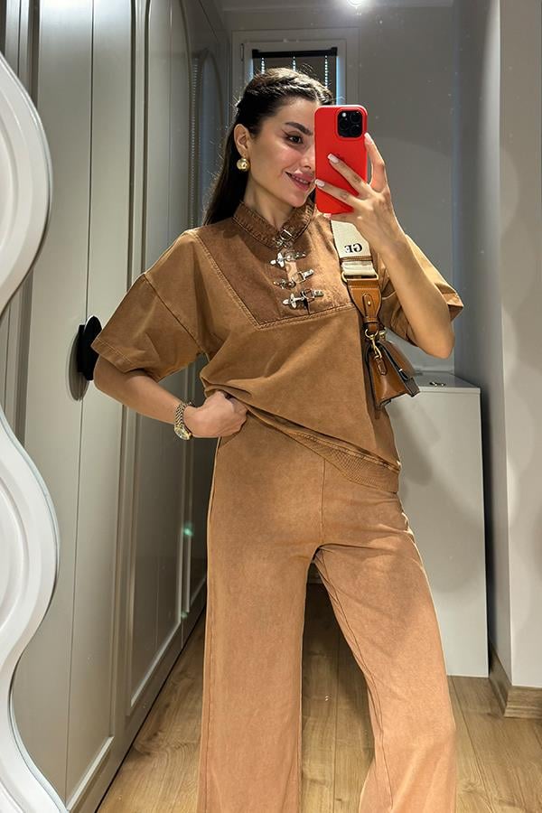 Adias Yakası Aksesuarlı Yıkama Takım - Kahve