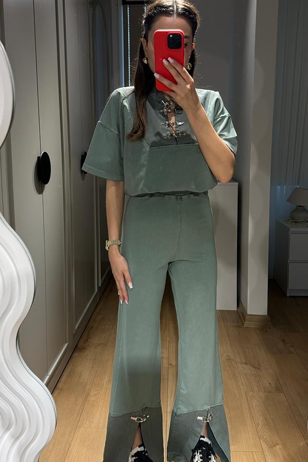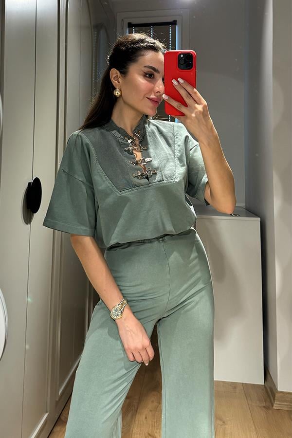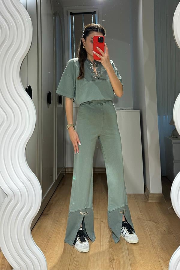 Adias Yakası Aksesuarlı Yıkama Takım - Yeşil
