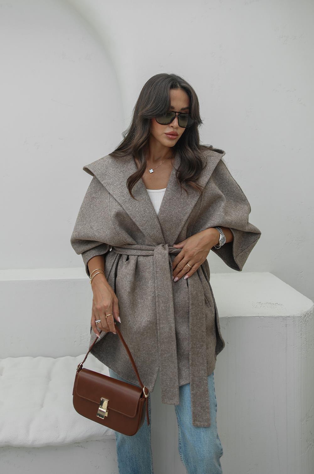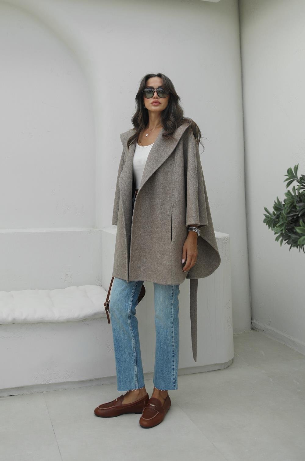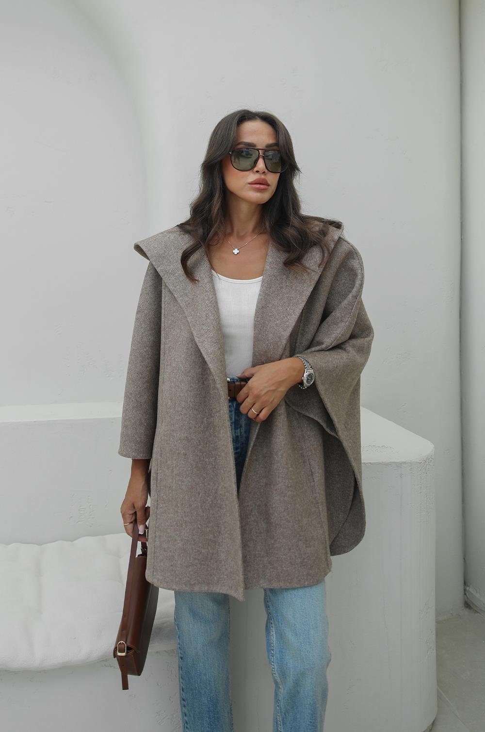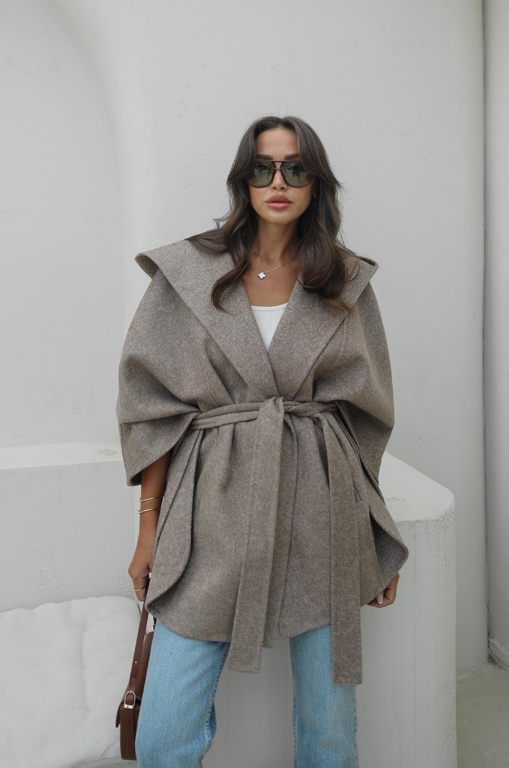 BEJ KAPÜŞONLU KUŞAKLI YÜN PANÇO
