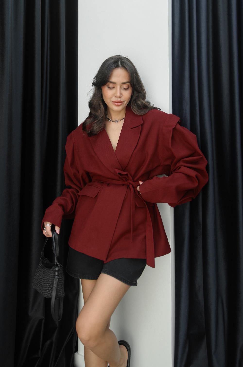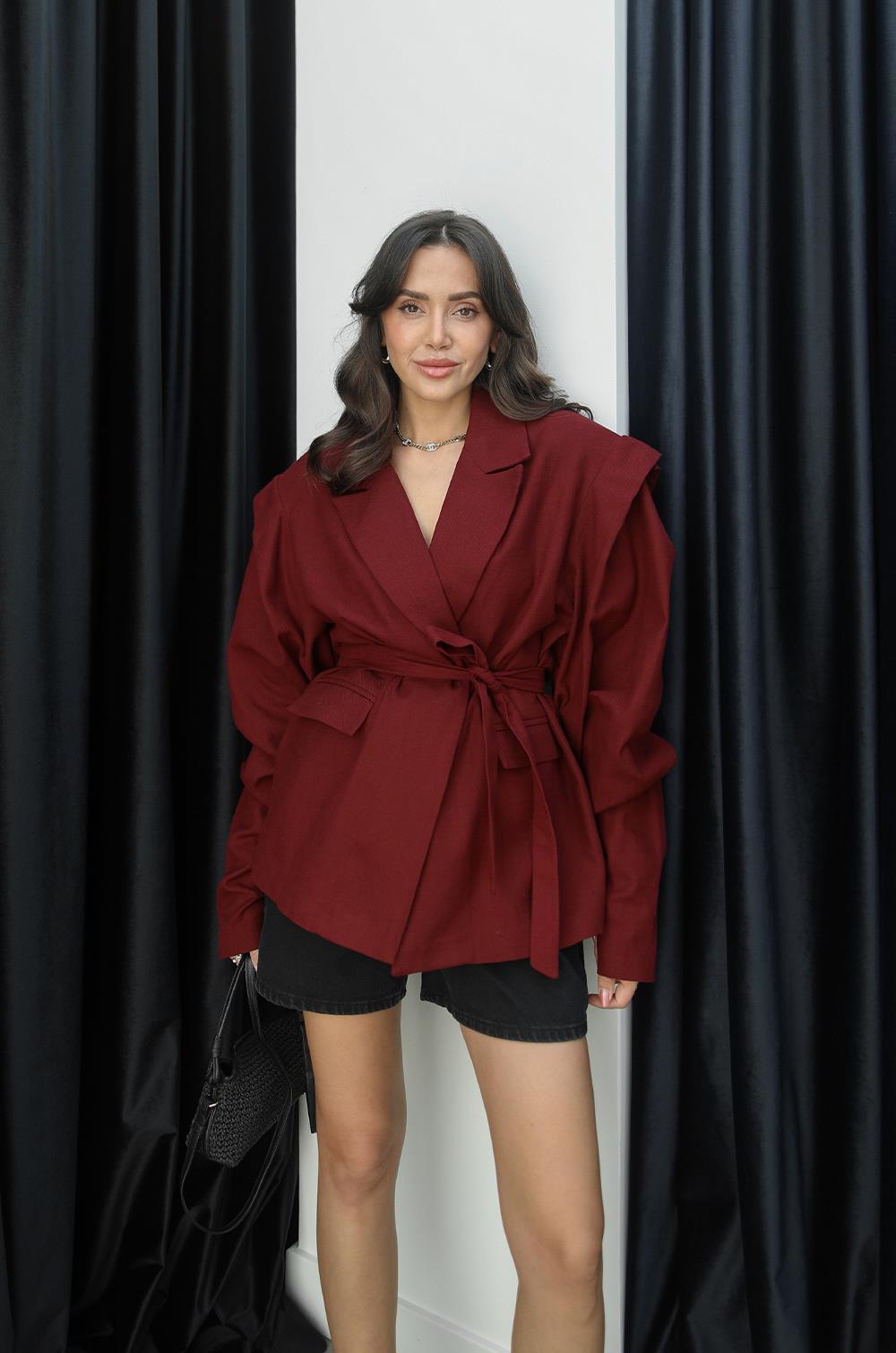 BORDO SALVIA VATKALI KUŞAKLI KETEN CEKET
