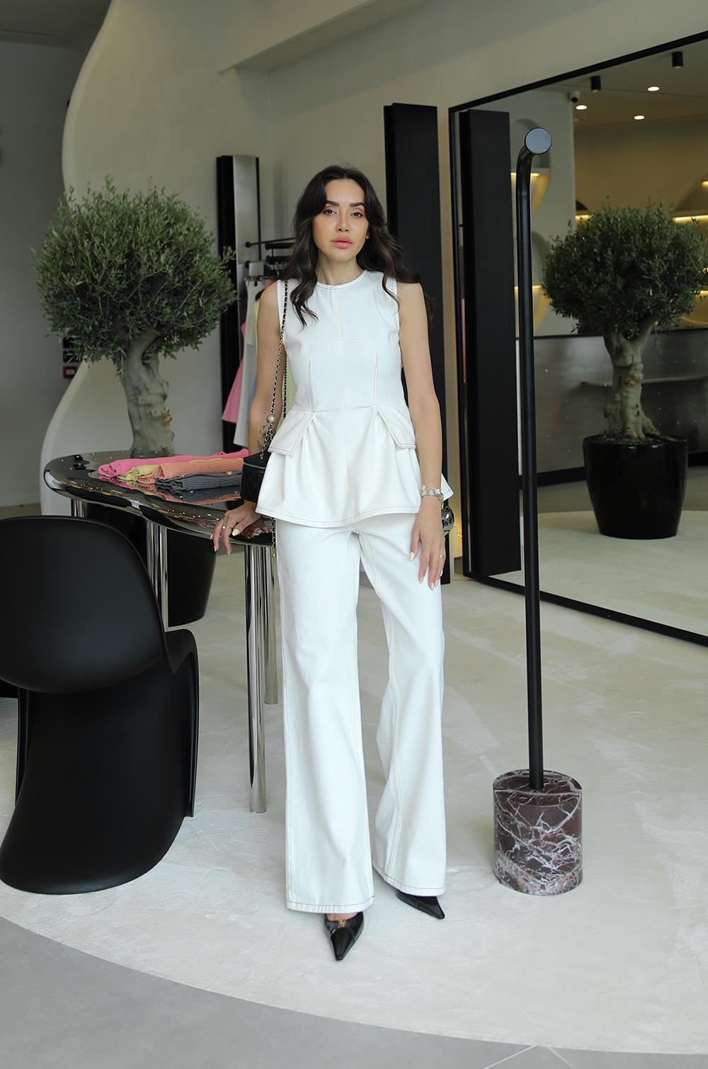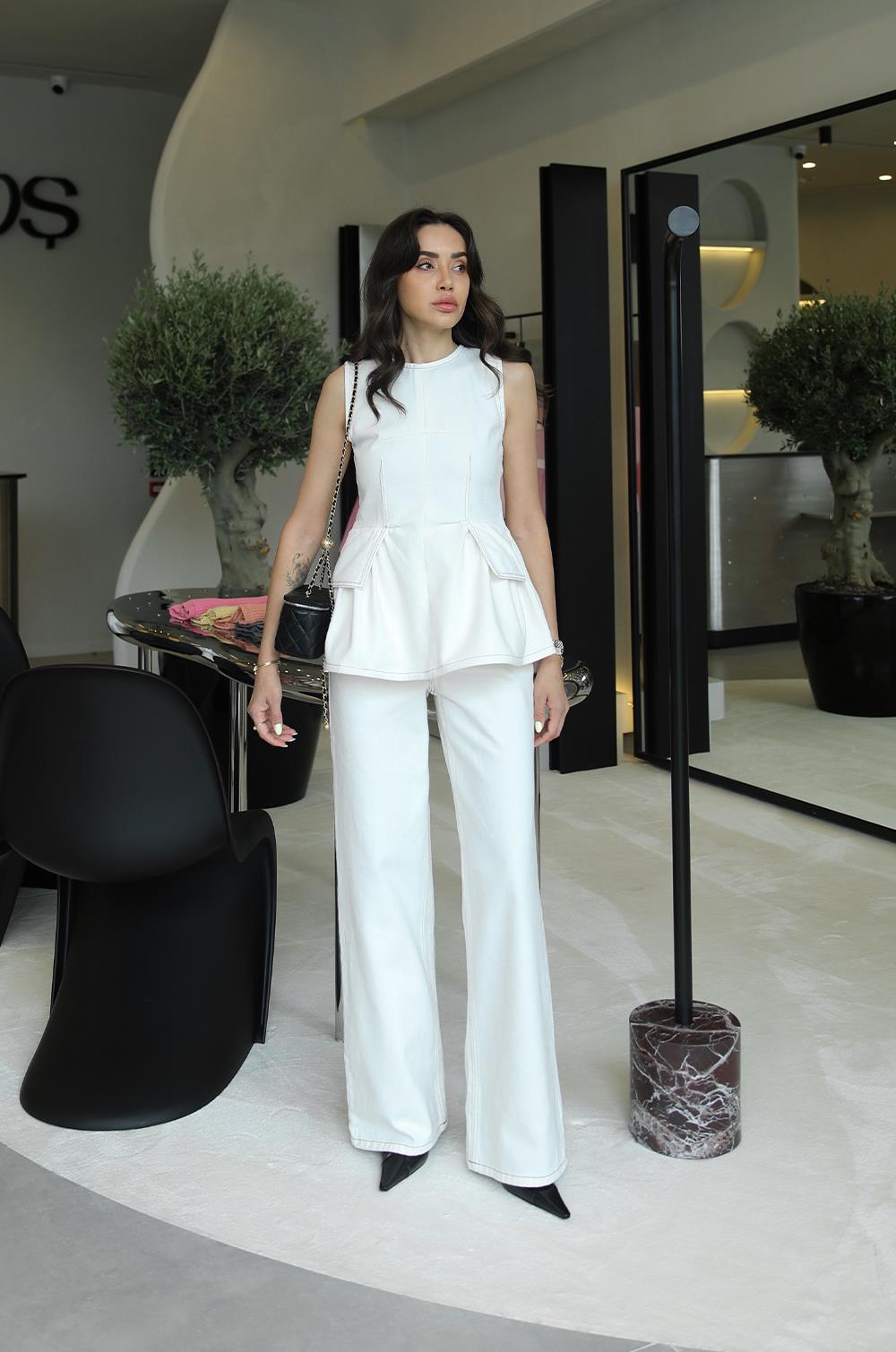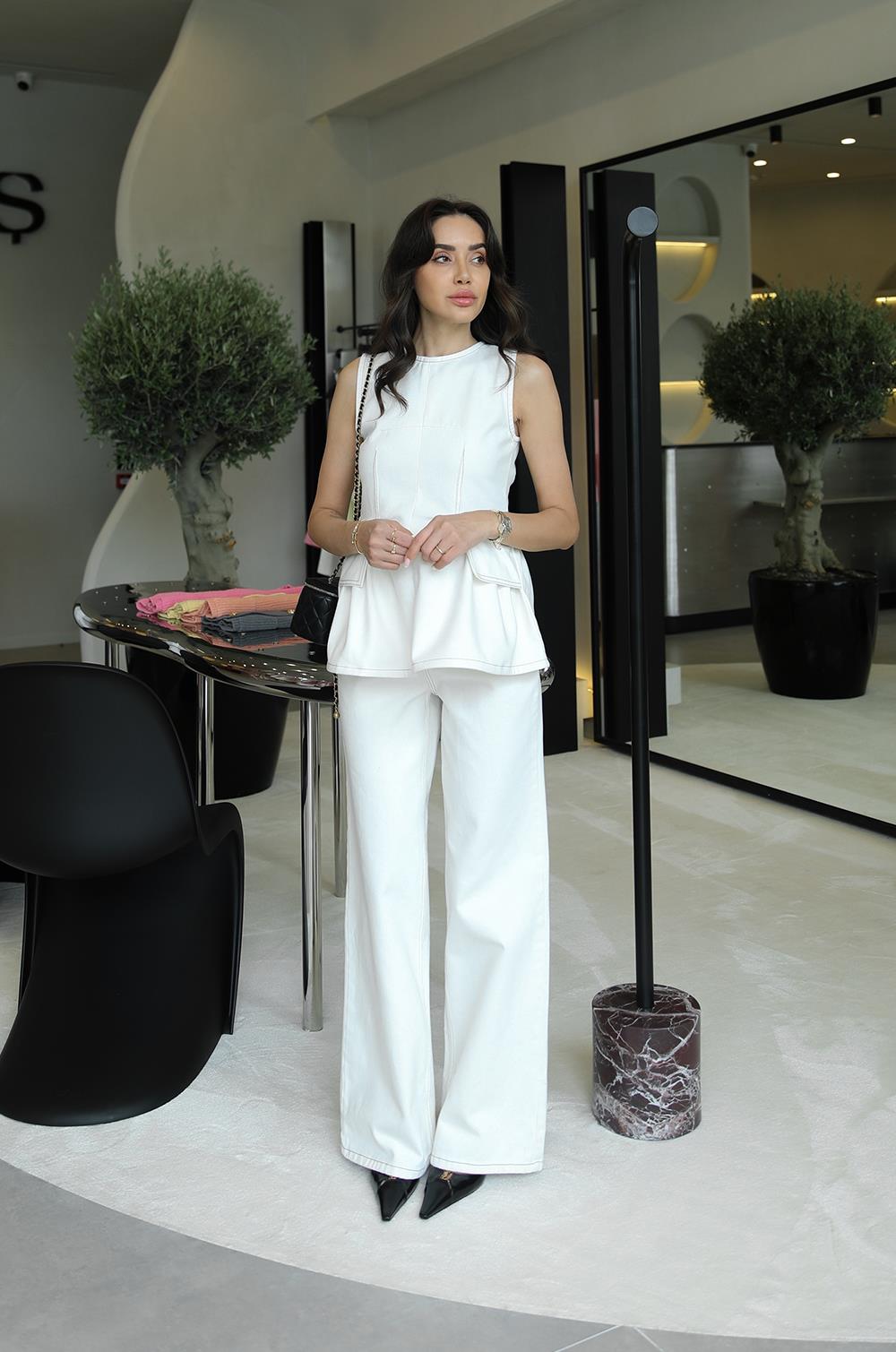 EKRU DIKIŞ DETAYLI DENIM TAKIM