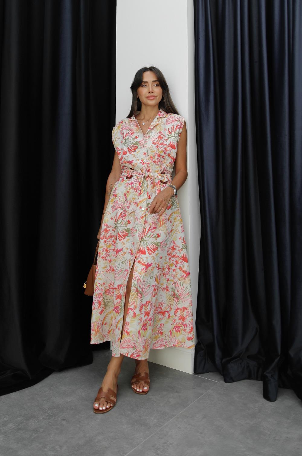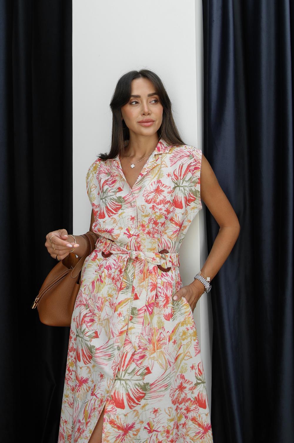 EKRU LORRE ÇIÇEK DESENLI KETEN KARIŞIMLI ELBISE