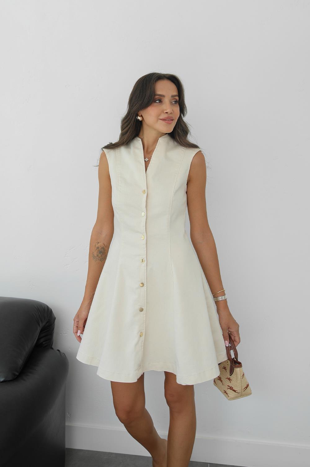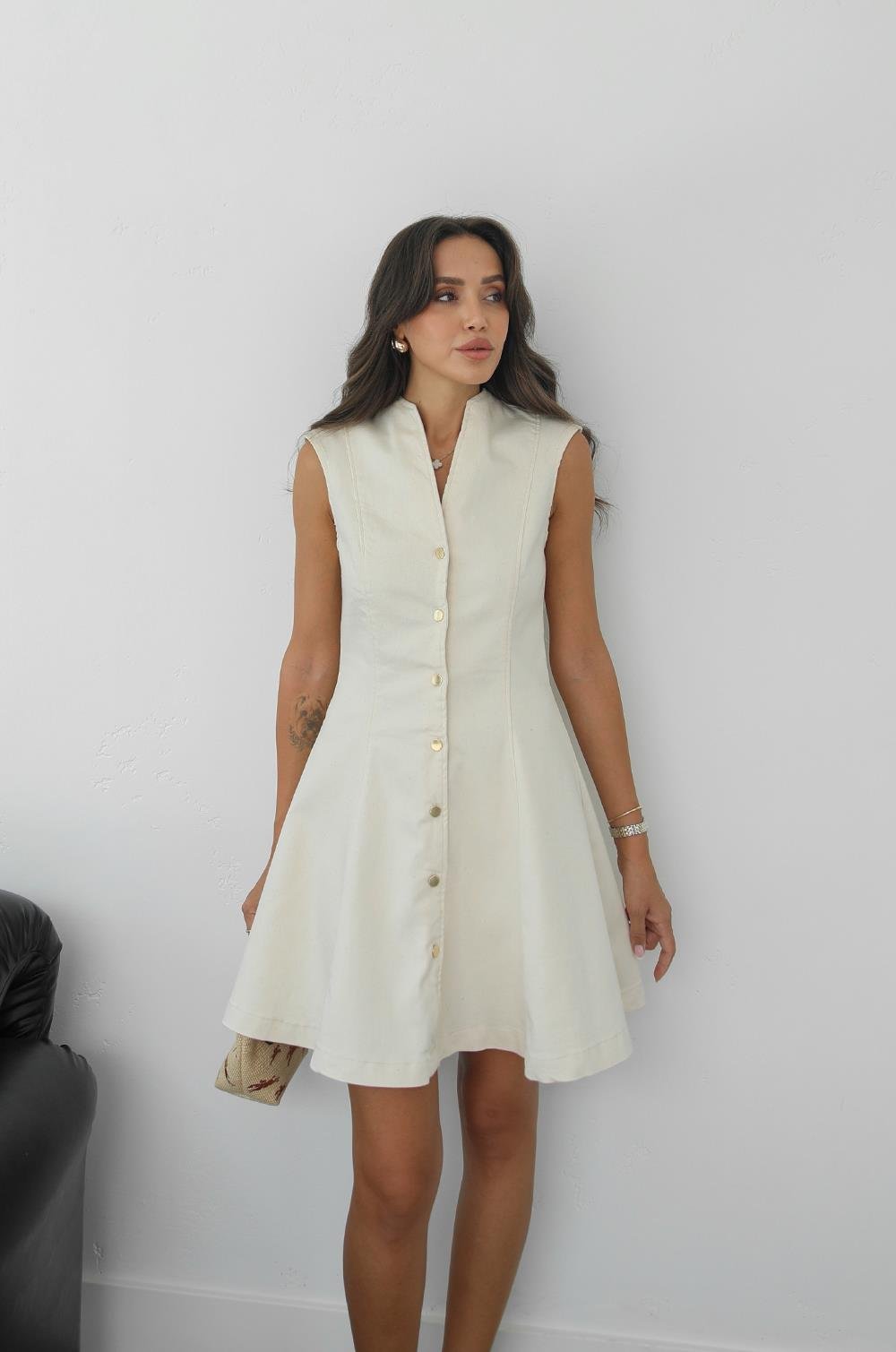 EKRU V YAKALI LIKRALI DENIM ELBISE