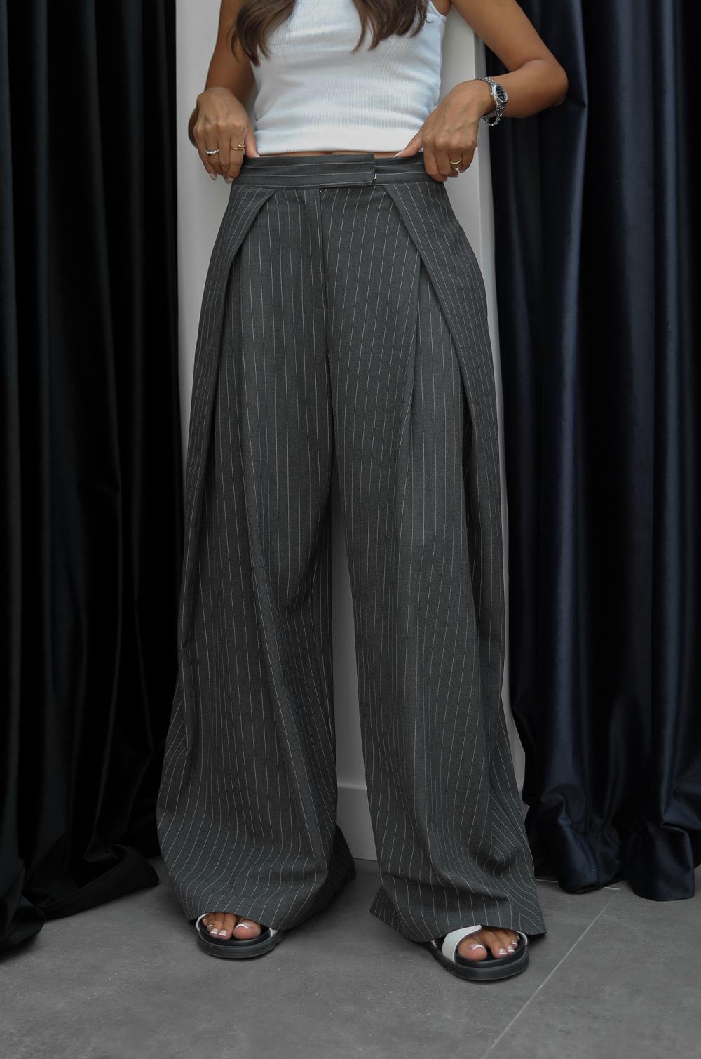 GRI ÇIZGILI DÜŞÜK BEL PANTOLON