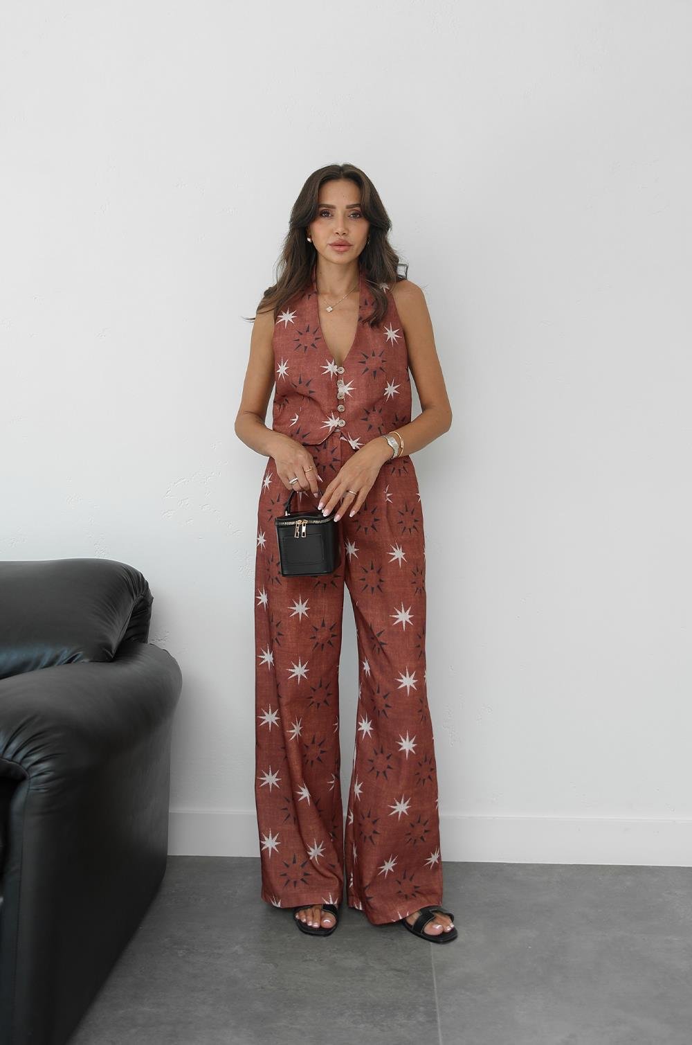 KAHVERENGI YILDIZ DESENLI YELEK PANTOLON TAKIM