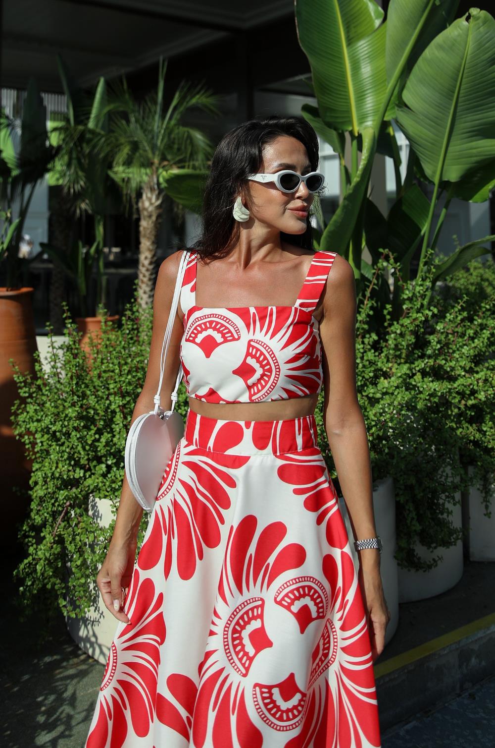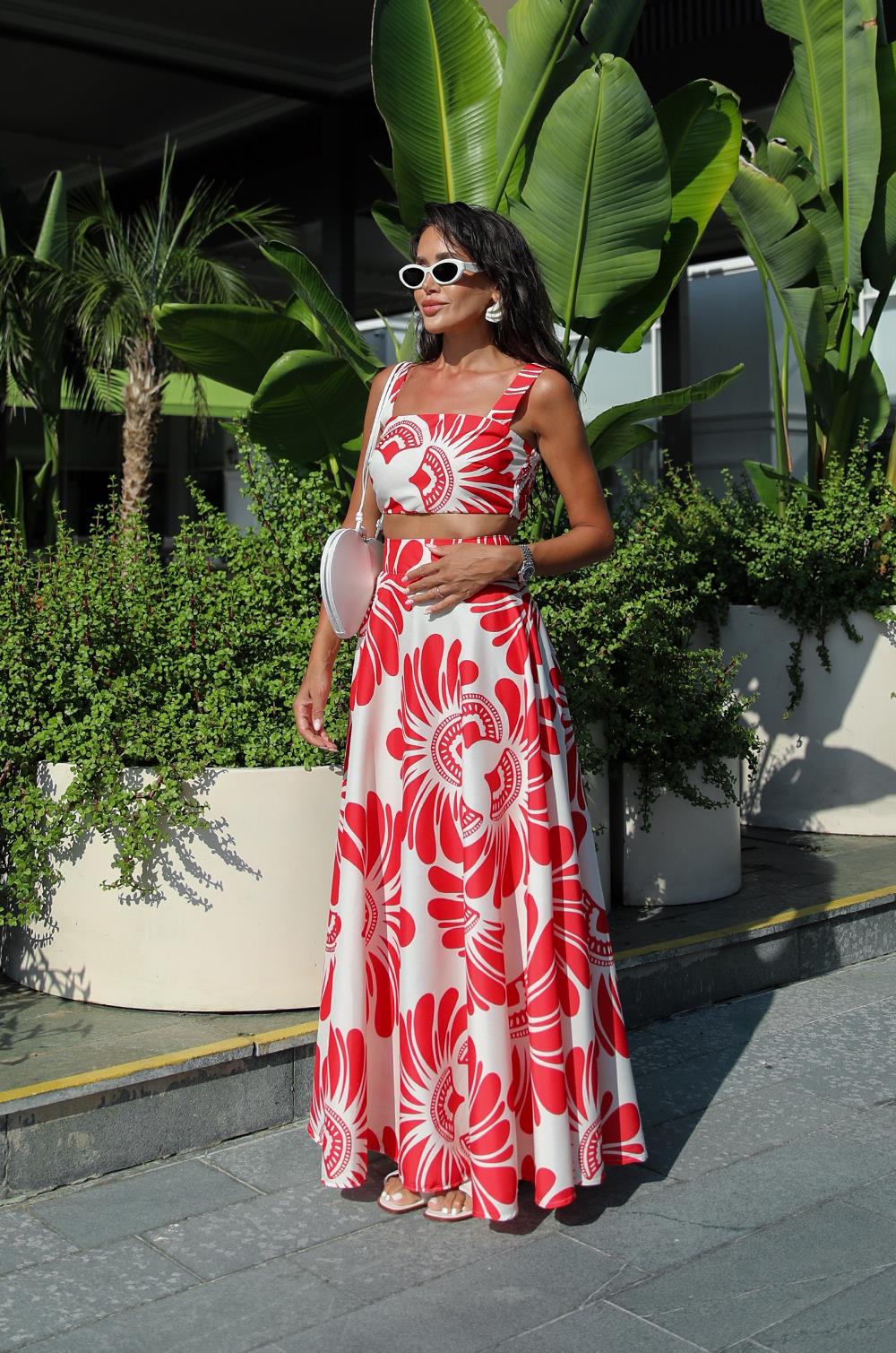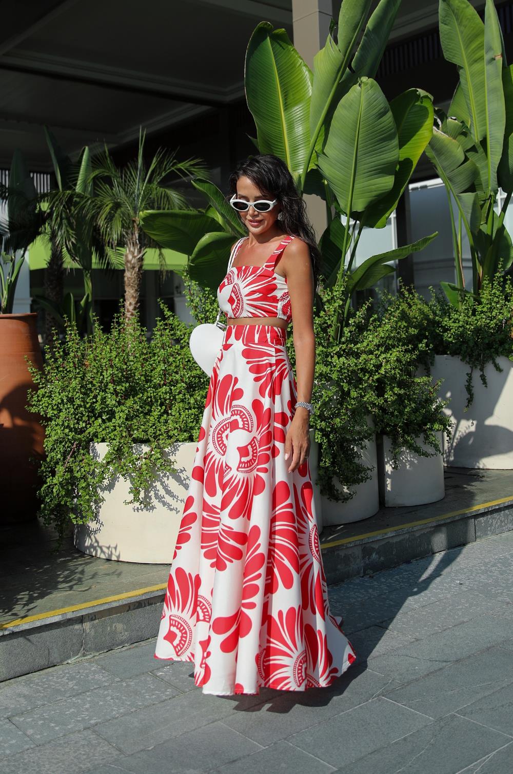 KIRMIZI DESENLI CROP BLUZ ETEK TAKIM